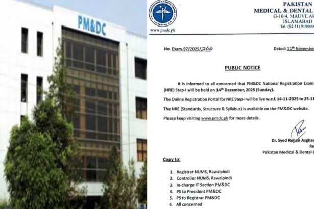 ISLAMABAD: The Pakistan Medical and Dental Council (PMDC) has officially announced the date for the upcoming National Registration Examination (NRE) Step-I, confirming that the examination will take place on Sunday, December…