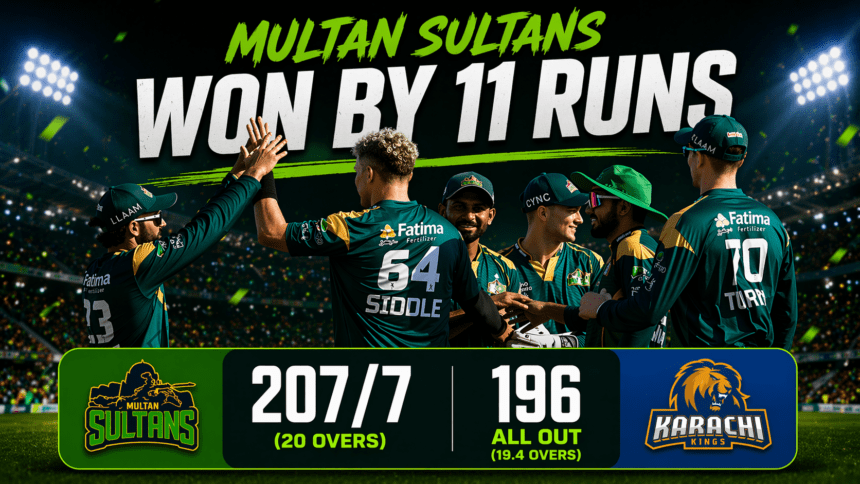 Multan Sultans held their nerve in a high-scoring PSL clash on Sunday, beating Karachi Kings by 11 runs after posting 207 for 7 and then bowling Karachi out for 196 in 19.4 overs at the National Stadium. The result gave Multan two points in a game that swung wildly, especially at the death.