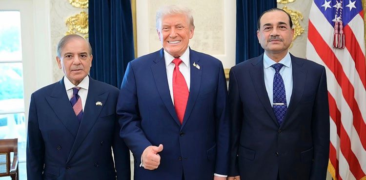 Washington – Prime Minister Shehbaz Sharif held a high-level meeting with US President Donald Trump at the Oval Office in the White House. The meeting lasted for one hour and twenty minutes and was attended by Pakistan’s Army Chief, Field Marshal Syed Asim Munir.