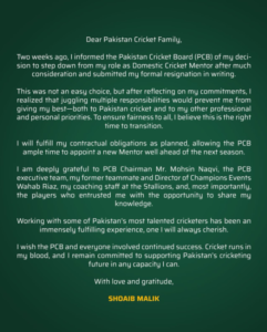 Former Pakistan captain Shoaib Malik has confirmed that he resigned from his role as a mentor in domestic cricket for the Pakistan Cricket Board (PCB), citing personal commitments and responsibilities. In a statement shared on Instagram,