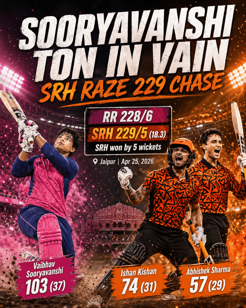 Vaibhav Sooryavanshi lit up Jaipur with a breathtaking 103 off 37 balls, but Sunrisers Hyderabad still stormed past Rajasthan Royals’ 228 for 6, sealing a five-wicket win with nine balls left in a chase that barely seemed possible when the innings break arrived. SRH finished on 229 for 5 in 18.3 overs, with Ishan Kishan’s 74 off 31 and Abhishek Sharma’s 57 off 29 tearing the game open early.
