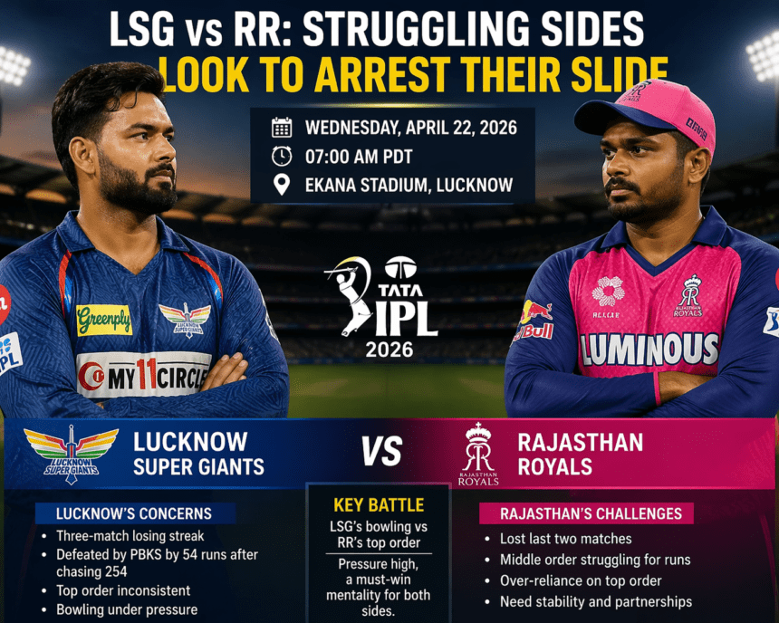 Lucknow Super Giants and Rajasthan Royals head into Wednesday night’s IPL 2026 meeting in Lucknow with the same basic need: stop the drift before it turns into something bigger. The match, scheduled for April 22 at the Ekana Stadium, arrives with LSG down in ninth place on four points from six games, while RR are still third with eight points from six but suddenly looking a lot less comfortable after back-to-back defeats.