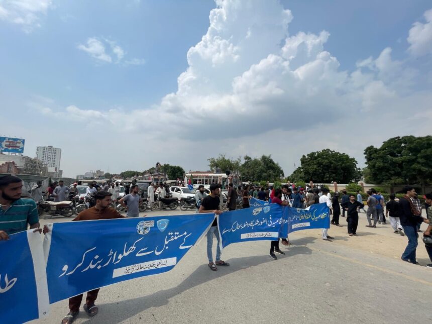 Karachi (Staff Reporter): The Islami Jamiat Talaba (IJT) staged protests across Karachi on Monday and Tuesday against the expulsion of students from Dawood University of Engineering and Technology (DUET). The demonstrations caused severe traffic jams on at least eight major roads of the city, leaving commuters stranded for hours.