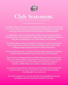 In their statement, Sydney Sixers expressed condolences to those affected by the shooting and confirmed that a moment of silence will be observed before the match. Players will also wear black armbands in tribute to the victims.