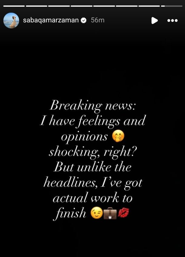 اس ردِعمل کے جواب میں سبا قمر نے انسٹاگرام پر اپنی رائے دیتے ہوئے کہا کہ وہ اپنے کام میں مصروف ہیں، اور انہیں حیرت ہے کہ ان کے جذبات و خیالات کو ’’بریکنگ نیوز‘‘ سمجھا جا رہا ہے۔ انہوں نے مزید کہا کہ ہر انسان کو اپنی پسند اور ناپسند کا حق ہے۔